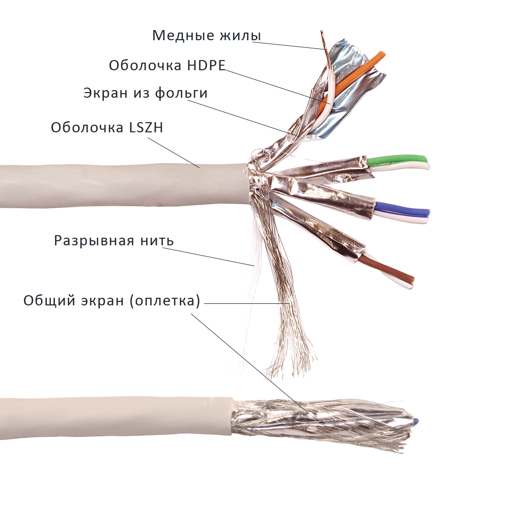 В конструкцию кабеля входит 4 витых пары в индивидуальных фольгированных экранах. Общий экран из оплетки медными лужеными проволоками обеспечивает надежную защиту проводников кабеля от электромагнитных помех. Оболочка кабеля – LSZH (малодымящая, не содержащая галогенов). На оболочке кабеля нанесены последовательные метровые метки длины.