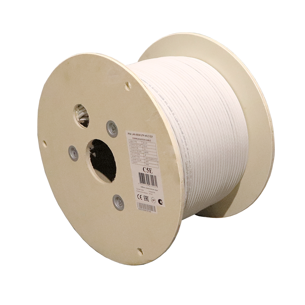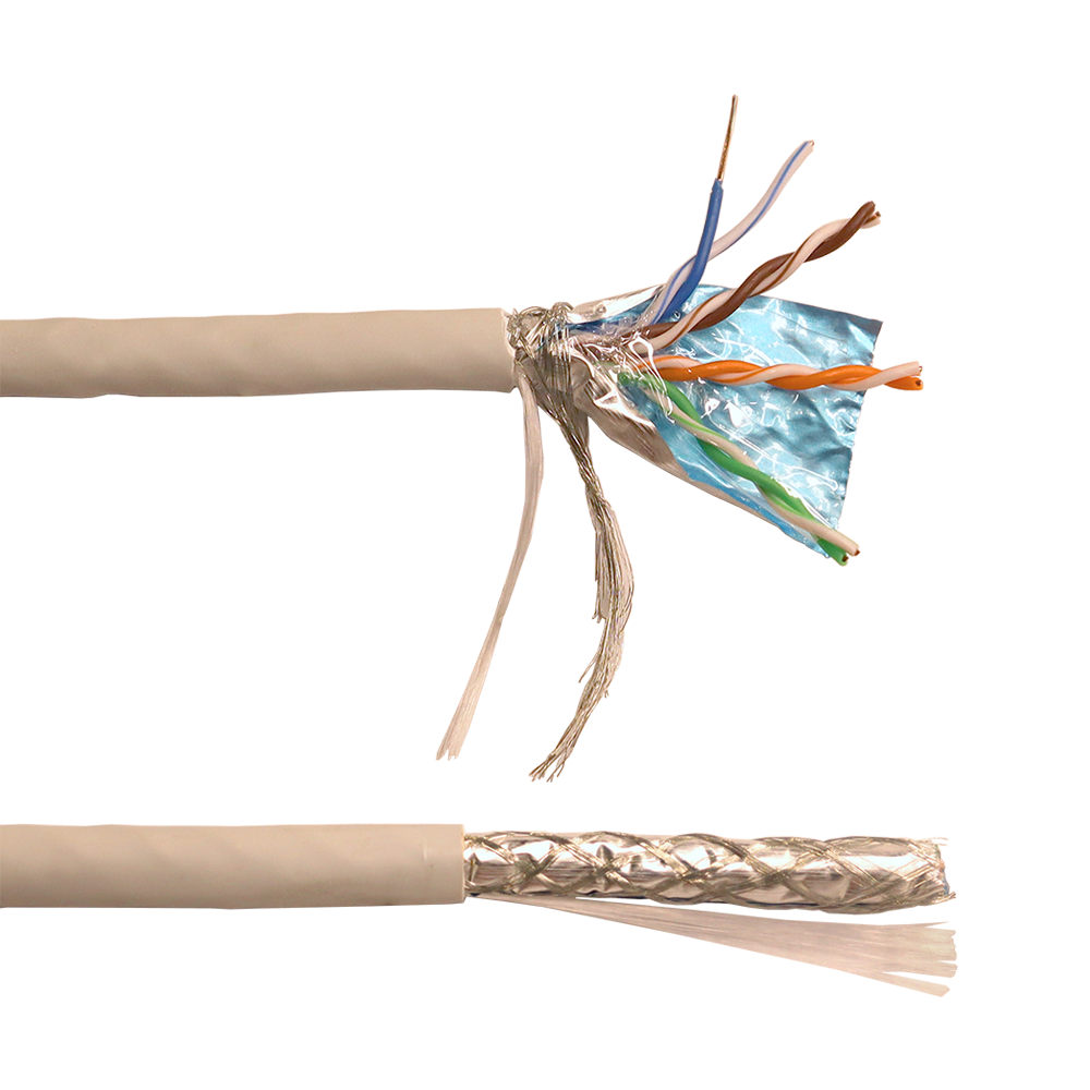 Четыре витых пары обернуты полиэтиленовой пленкой и заключены в общий экран из фольги, затем в проволочную оплетку. Верхним слоем является оболочка из HFLT (не поддерживающий горение, для групповой прокладки с отсутствием коррозийно-активных и токсичных веществ при тлении). На оболочке кабеля нанесены последовательные метровые метки длины.