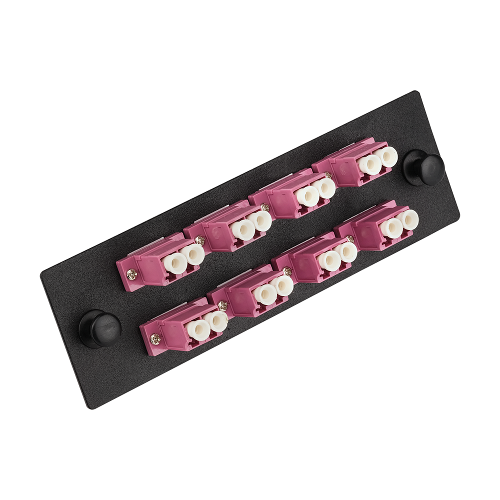 Metal adapter faceplates are intended for installation of LAN-MPO-AM-MM optical adapters in LAN-FOBM enclosures. Adapter faceplate capacity is 8 simplex or duplex adapters. Adapter faceplates are equipped with optical adapters installed at the factory. The use of pre-filled adapter panels significantly reduces the time required for installing optical distribution boxes. The faceplates are fastened in the enclosure with plastic clamps. Made of steel. Color is black (RAL9004). |