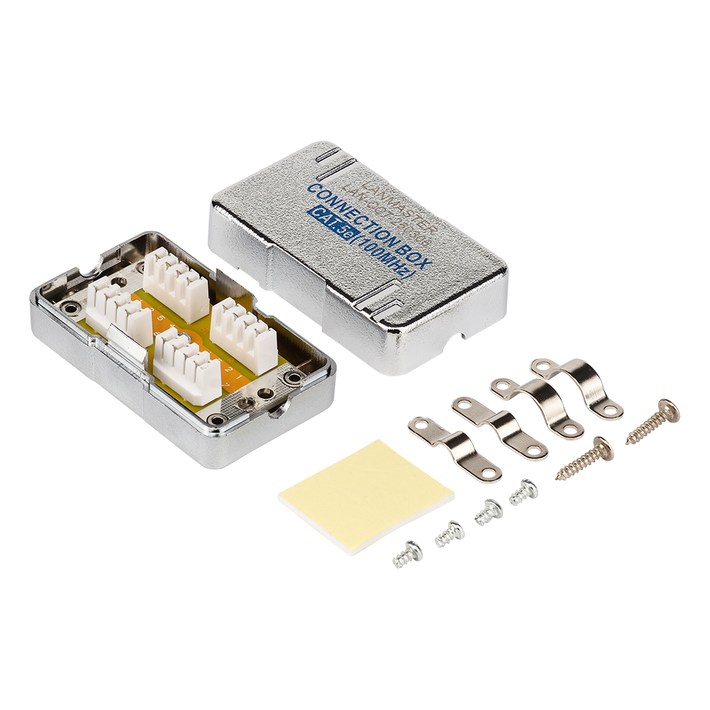 he connection box is designed to connect two lines of shielded 4-pair cable by termination on IDC wiring blocks. Category 5E compliant. It is used during repair work to quickly restore the connection of a damaged cable, as well as to organize a consolidation point. Can be mounted on a wall, ceiling, or any available surface. Due to its low weight and dimensions, it can remain unsecured, or fit inside the cable harness. Package included: