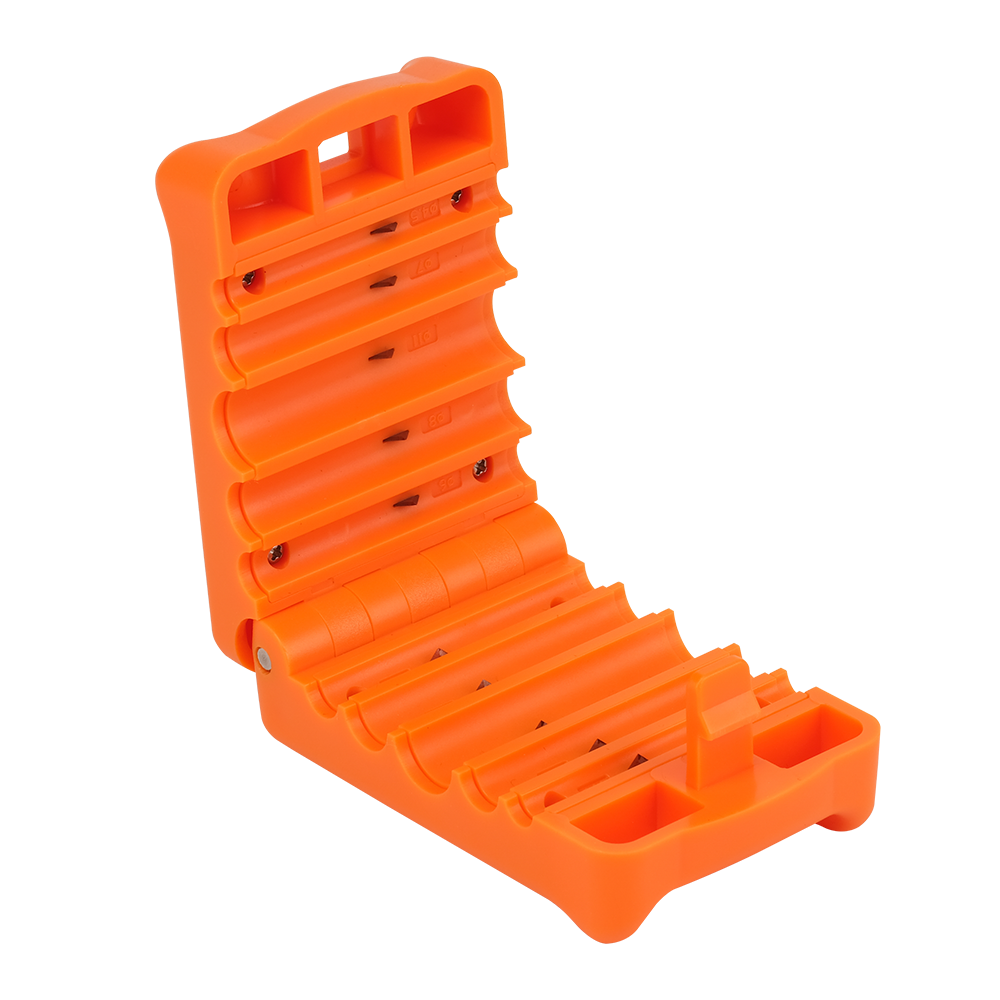 The tool has grooves of different diameters (from 4.5 to 11 mm). Inside each groove there are angled blades at the top and. The tool is used for longitudinal cutting of cable jackets, protective tubes. To make the cut, place a section of cable in a suitable groove, close the tool, and pull the cable through it.