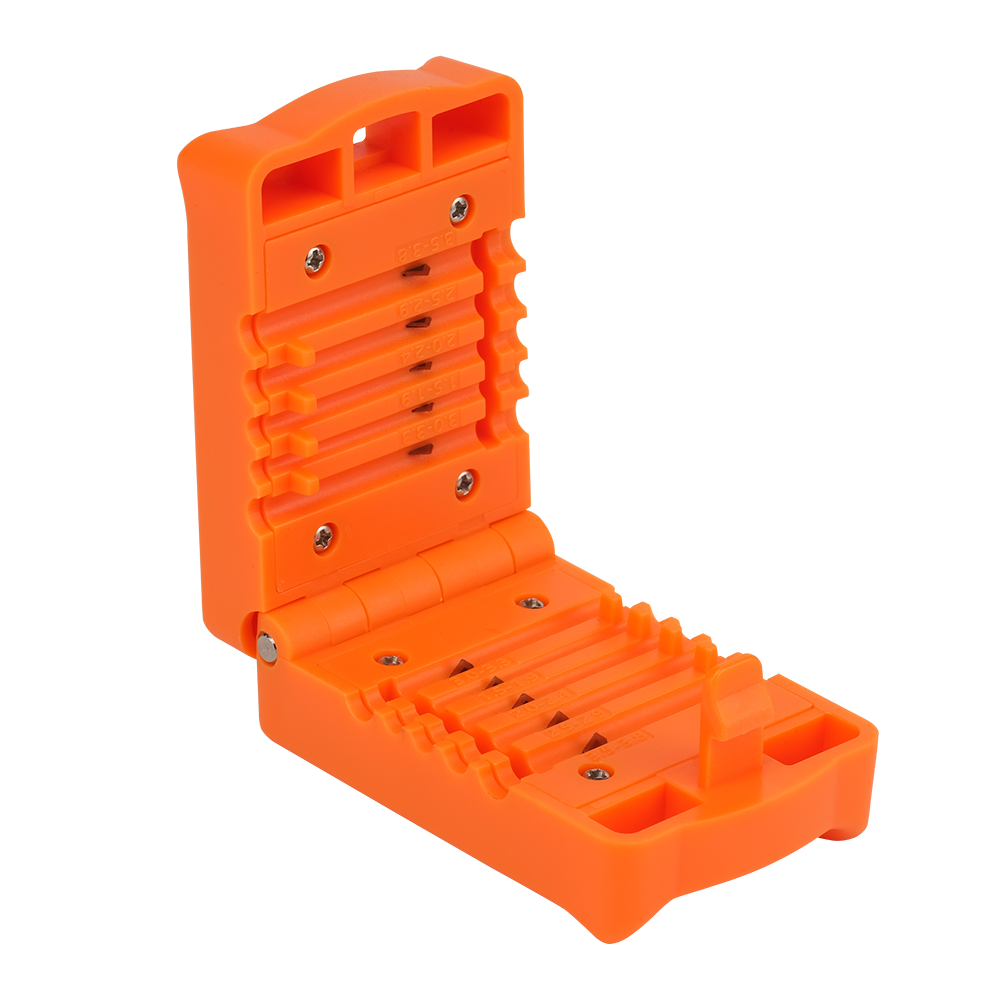 The tool has grooves of different diameters (from 1.5 to 3.8 mm). Inside each groove there are angled blades at the top and bottom. The tool is used to cut the optical cable modules longitudinally. To make the cut, place a section of cable in a suitable groove, close the tool, and pull the cable through it.