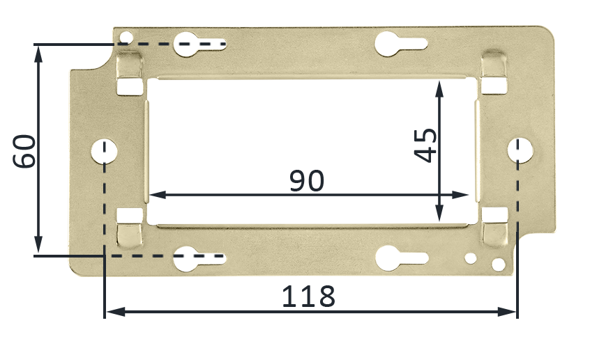 Metal mounting frames for Mosaic series wiring accessories and data sockets of the same standard size. Designed to install on Mosaic flush and wall mounting boxes with appropriately sized faceplates. Available in three basic sizes – 45x45, 45x90, and 45x135. Made of steel. For options of using this product see document: Typical assemblies of data sockets with LANMASTER and TWT components |
