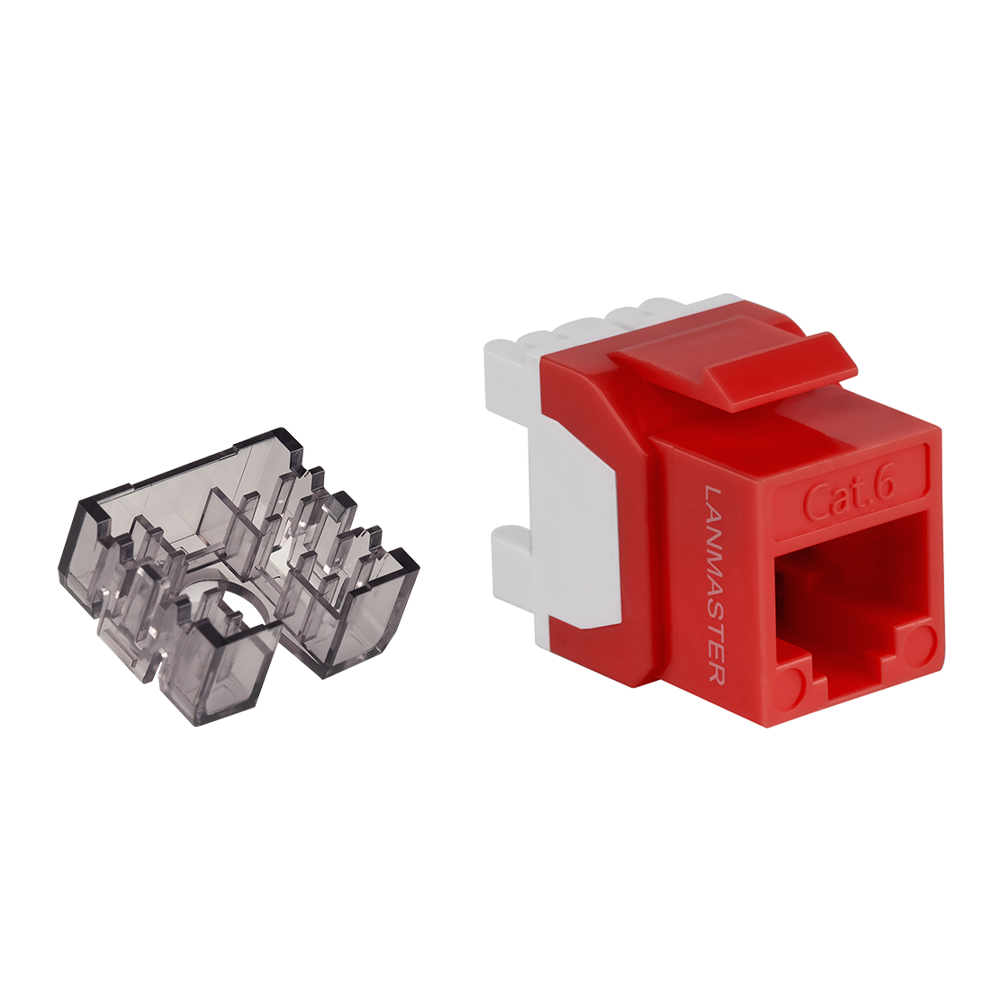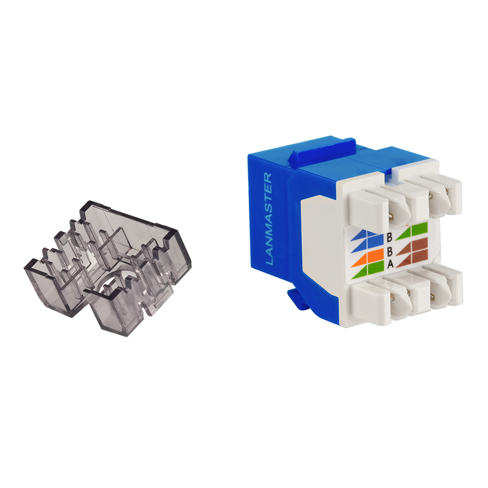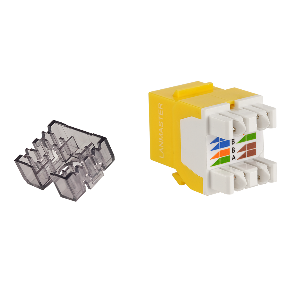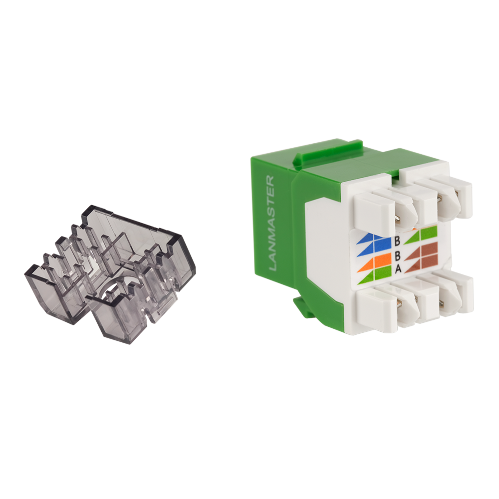 The module can be used to complete unshielded telecommunication sockets installed in wall trunks, in a wall box, also for installation in modular patch panels (see the compatibility items). Category 5E compliant. The main advantage of this module over similar LANMASTER products is the presence of a built-in shutter, which is automatically recessed when patch cord inserts in the module. The width of this module allows it to be installed in high density patch panels from LANMASTER and other manufacturers. Color coding of the entire panel or its individual elements allows for visual identification of ports. Therefore, multi-colored Keystone modules can be used to increase the efficiency of SCS administration. There is an eight-pin RJ-45 socket on the front side of the module, and there is a block for eight contacts of the IDC110 type on the back side, located at an angle of 180˚ to the front surface of the module.