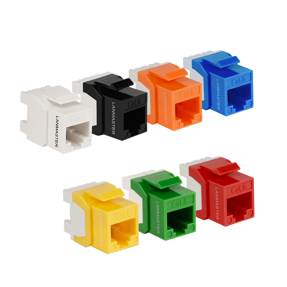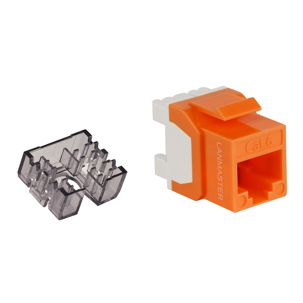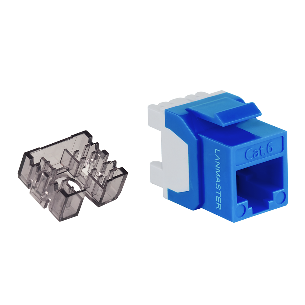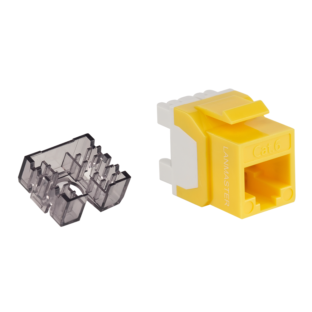 The module can be used to complete unshielded telecommunication sockets installed in wall trunks, in a wall box, also for installation in modular patch panels (see the compatibility items). Category 5E compliant. The main advantage of this module over similar LANMASTER products is the presence of a built-in shutter, which is automatically recessed when patch cord inserts in the module. The width of this module allows it to be installed in high density patch panels from LANMASTER and other manufacturers. Color coding of the entire panel or its individual elements allows for visual identification of ports. Therefore, multi-colored Keystone modules can be used to increase the efficiency of SCS administration. There is an eight-pin RJ-45 socket on the front side of the module, and there is a block for eight contacts of the IDC110 type on the back side, located at an angle of 180˚ to the front surface of the module.