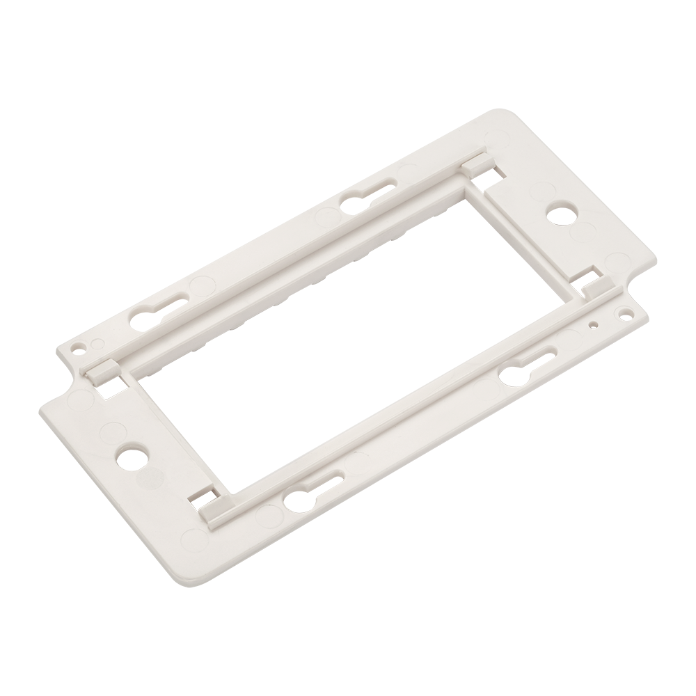 Plastic mounting frames for Mosaic series wiring accessories and data sockets of the same standard size. Designed to install on Mosaic flush and wall mounting boxes with appropriately sized faceplates. Available in three basic sizes – 45x45, 45x90, and 45x135. Made of ABS. Color is white (RAL 9010). For options of using this product see document: Typical assemblies of data sockets with LANMASTER and TWT components. |