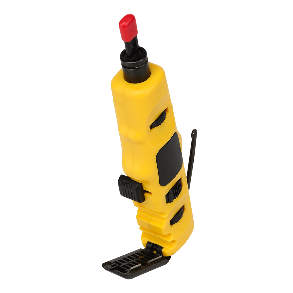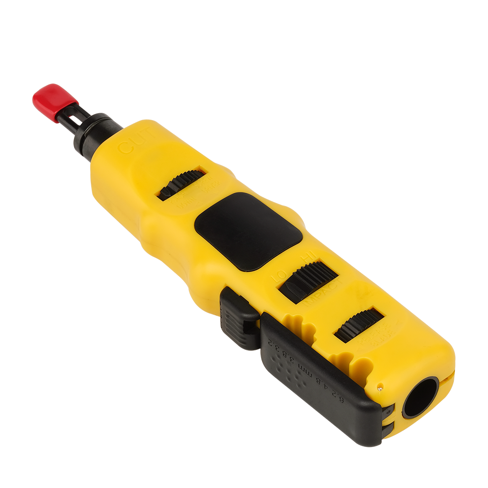 Профессиональный многофункциональный ударный инструмент предназначен для разделки кабеля витая пара на кроссах, патч-панелях или розетках с контактами типа 110/88. Поставляется с ножом 110/88 в комплекте. Нож обеспечивает заделку контактов с одновременным срезом излишка длины жил. Ударный механизм имеет регулировку усилия при монтаже, что позволяет обеспечить надежное соединение провода с контактами. Регулировка силы ударного механизма позволит подобрать наиболее комфортный из двух режимов работы. В конструкции корпуса предусмотрена складная плоская отвертка (для снятия плинтов с кронштейнов) и специальный крючок для извлечения кабеля из разъема при демонтаже. В тыльной части имеется отделение для хранения запасного ножа с пружинной фиксацией. С торцевой стороны располагается стриппер, механизм для зачистки внешней оболочки под четыре варианта диаметра кабеля. В комплект поставки входит насадка в виде двусторонней отвертки, по два размера каждой из бит. При необходимости, инструмент нужно перевести соответствующим переключателем на корпусе в режим «screw» и вставить насадку с отверткой. Характеристики: