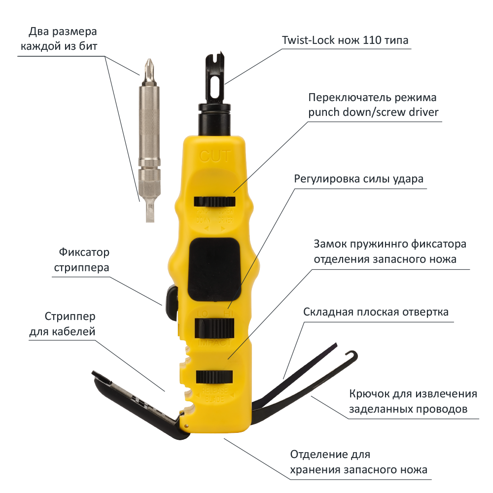 Ударный инструмент для разделки контактов 110-го типа, со стриппером и отверткой