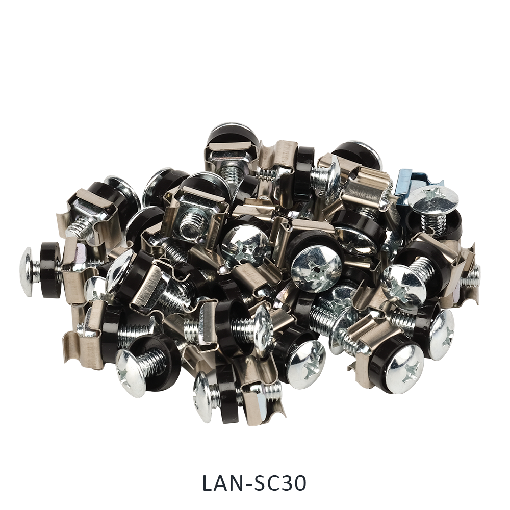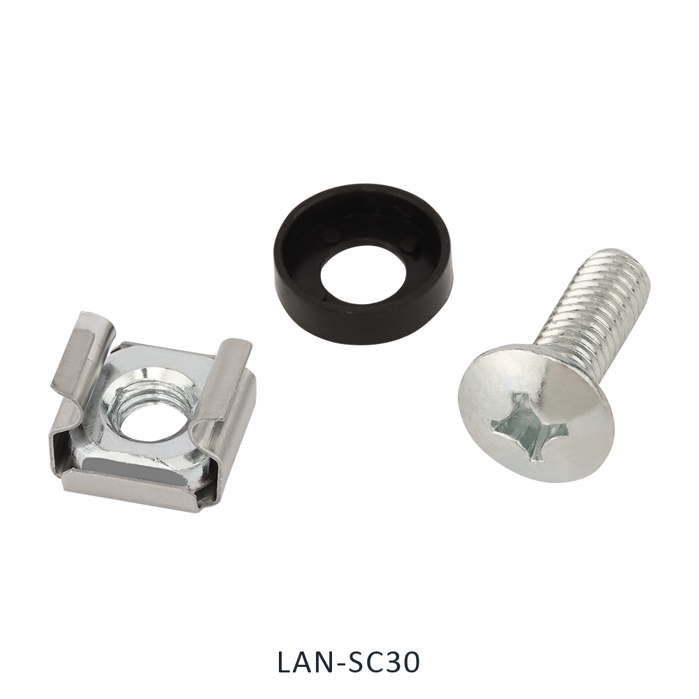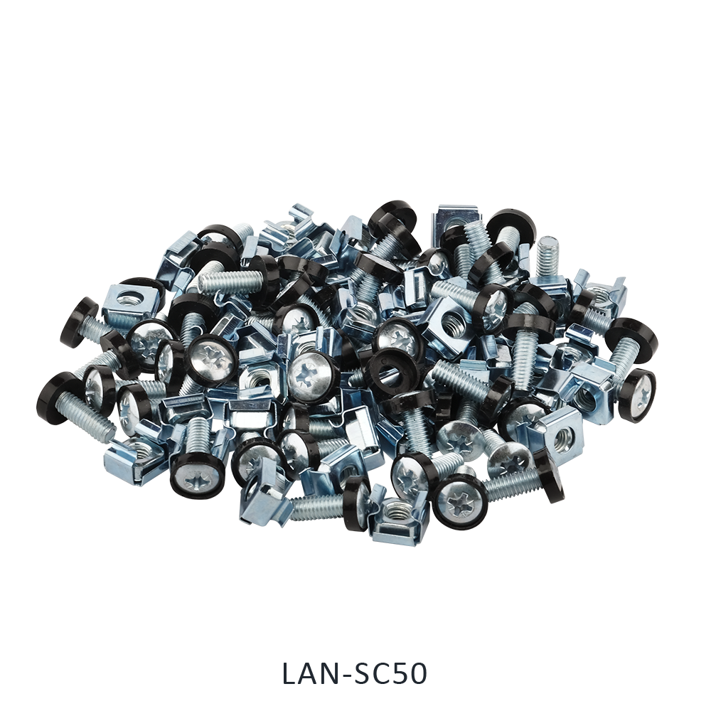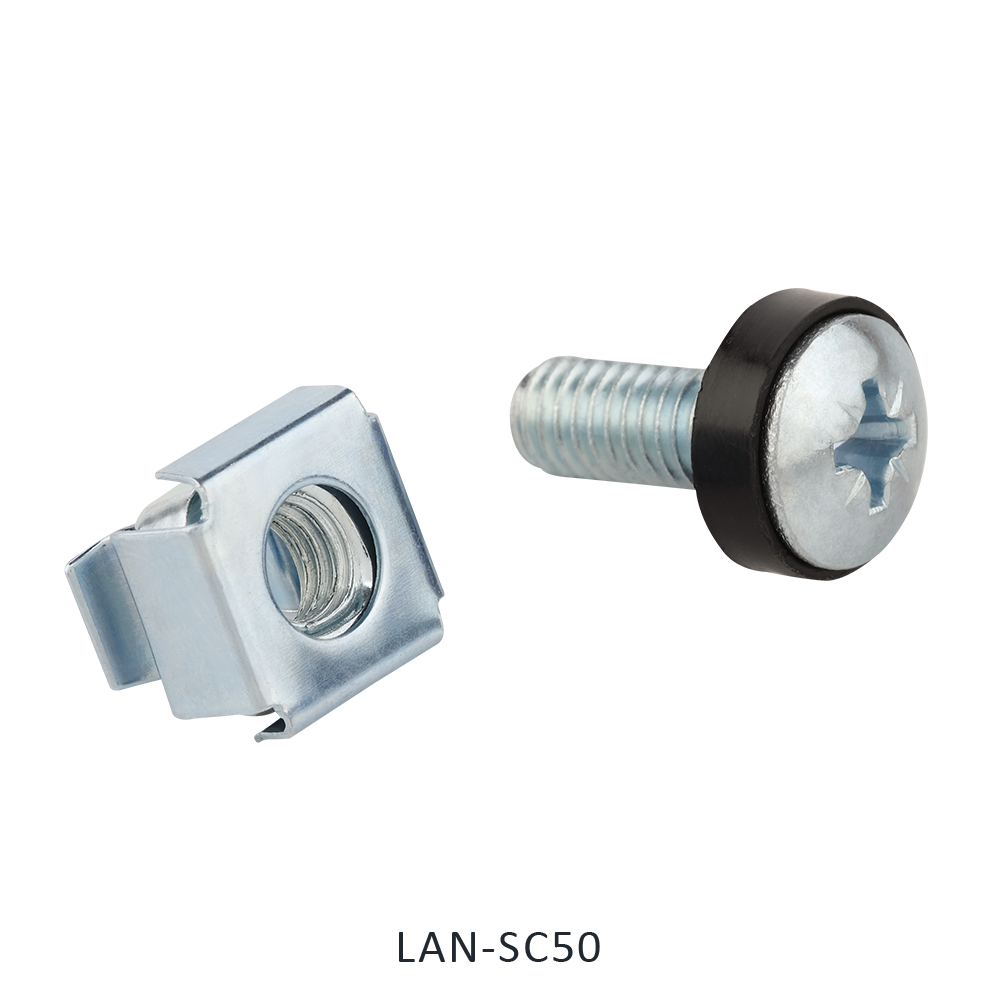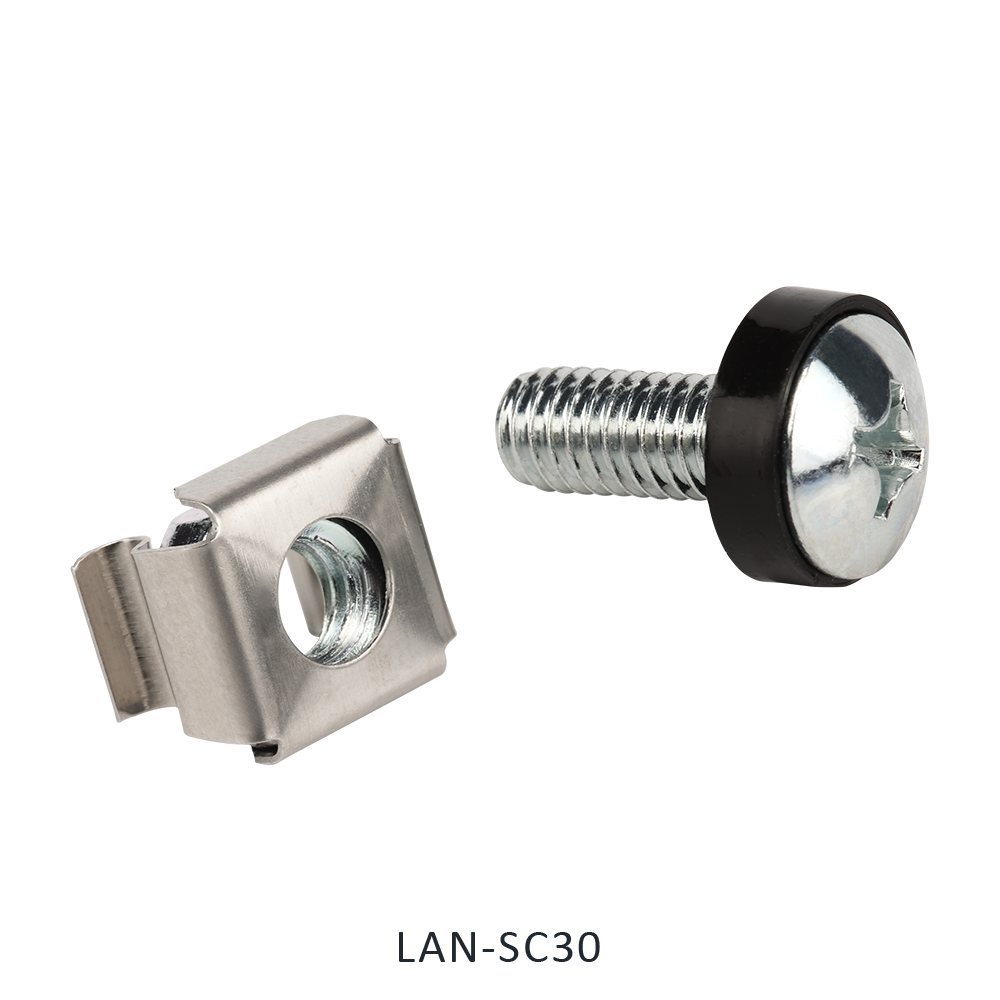 Screws with washers and cage nuts are provided for securing 19" equipment to cabinets and racks. Supplied in blister packs of 30 and 50 sets |