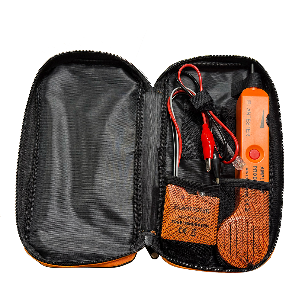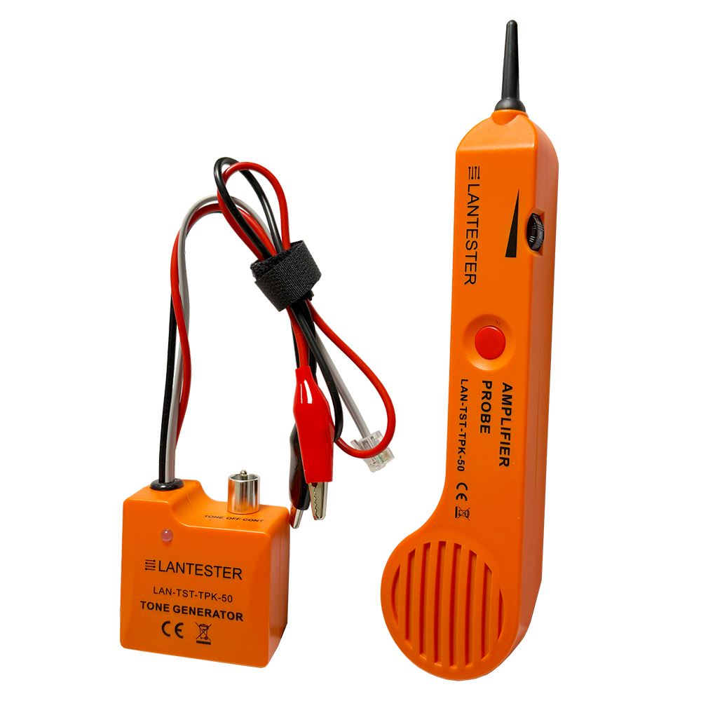 The LAN-TST-TPK-50 test kit consists of a tone generator and an inductive probe (receiver). The kit is used to: