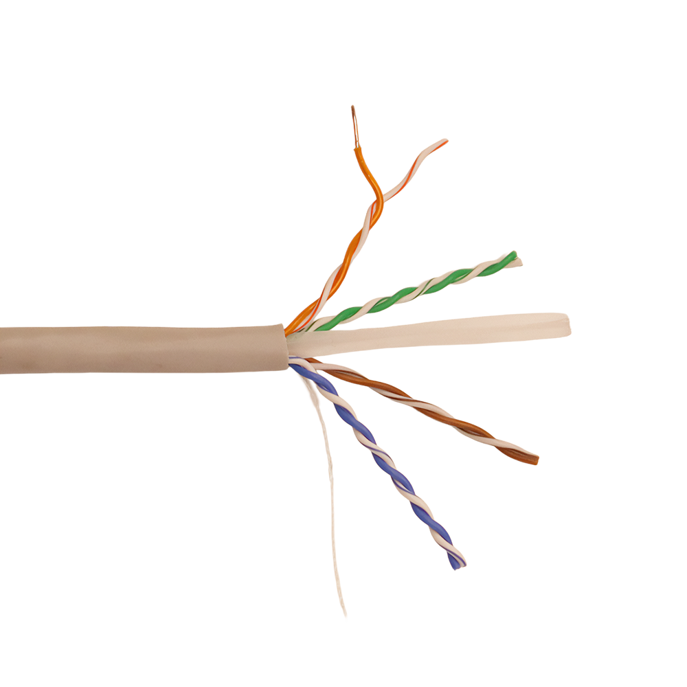 The cable comprises 4 pairs of stranded copper conductors. Conductor gauge is 23AWG. Each conductor is covered with HDPE (high density polyethylene) insulation. Two conductors are twisted with specially selected step in a single twisted pair. Pairs in the cable are parted with a separator which increase cross attenuation between the pairs. Four pairs and the separator are coated with single PVC jacket. There is a ripcord under the jacket to ease termination process.